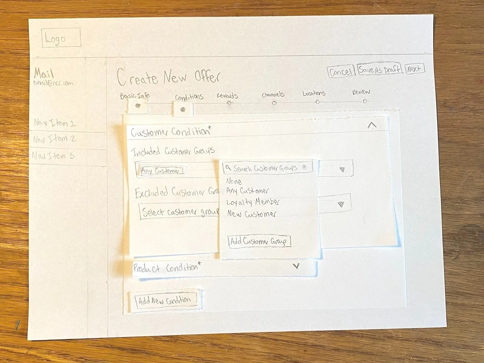 For example, in order to add a reward to your offer, you first had to add a product condition. However, in order to add a product condition you had to have first added a customer condition. In the existing system, none of this was indicated and was only made clear once you made a customer condition, which enabled the product condition option. Thus, we felt that by “forcing” users to follow this order we could eliminate any frustrations caused by this confusion. The wizard proceeds as follows: