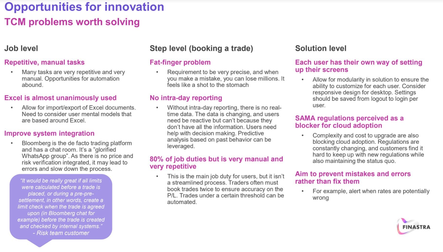 It’s often difficult to get buy-in from various business stakeholders, especially at a company that hasn’t fully incorporated design into the fabric of their products. During this project I did encounter some of this, which made it difficult to get the information we needed. In addition, we had a particularly hard time finding participants for the trader role. Because of the B2B nature of our business, we were not able to contact our direct users. Additionally, sourcing these participants from third parties (like UserTesting.com) proved to be less fruitful than hoped, as UserTesting’s incentives aren’t as appealing to high wage earners. After looking into hiring them through a consulting firm, it was determined their hourly rate was outside of the budget of this project. Thinking about who the needed participants of a study are (and how we will contact them) in the early phases of planning is an important step to not skip as that can surface any issues like what we encountered. The project also taught an great lesson in that it is important to roll with the punches during a project. It may not be possible to get direct interviews with a certain persona but that doesn’t mean useful information can’t still be found. When we weren’t able to directly contact any traders we then were able to locate some people within Finastra that had previously worked as traders and were willing to sit for an interview. The data they provided was still very useful and applicable.