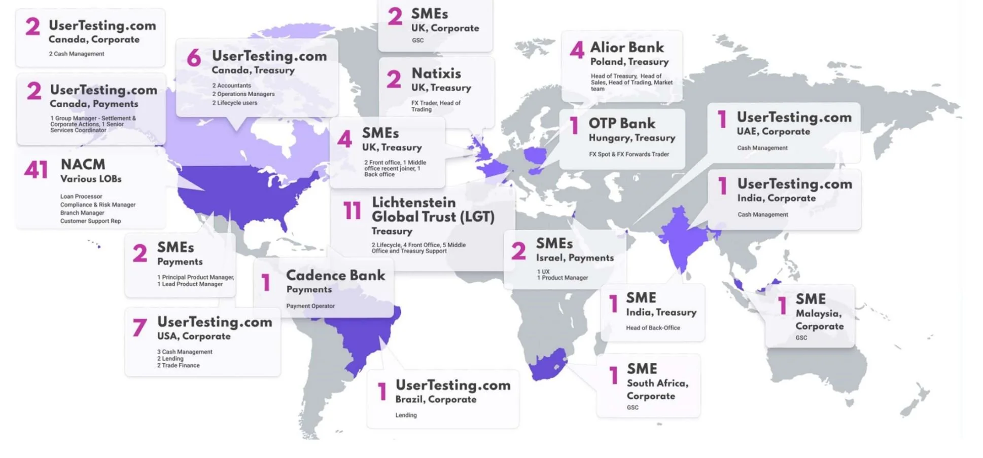 From all of this information, we were able to create a tailored list of interview questions, in addition to the interview questions that were being used by the larger project team. We used UserTesting to recruit participants from each of the four main areas of a treasury bank; front office, middle office, back office, and other. The graphic shown here displays the various interviews conducted for this project.